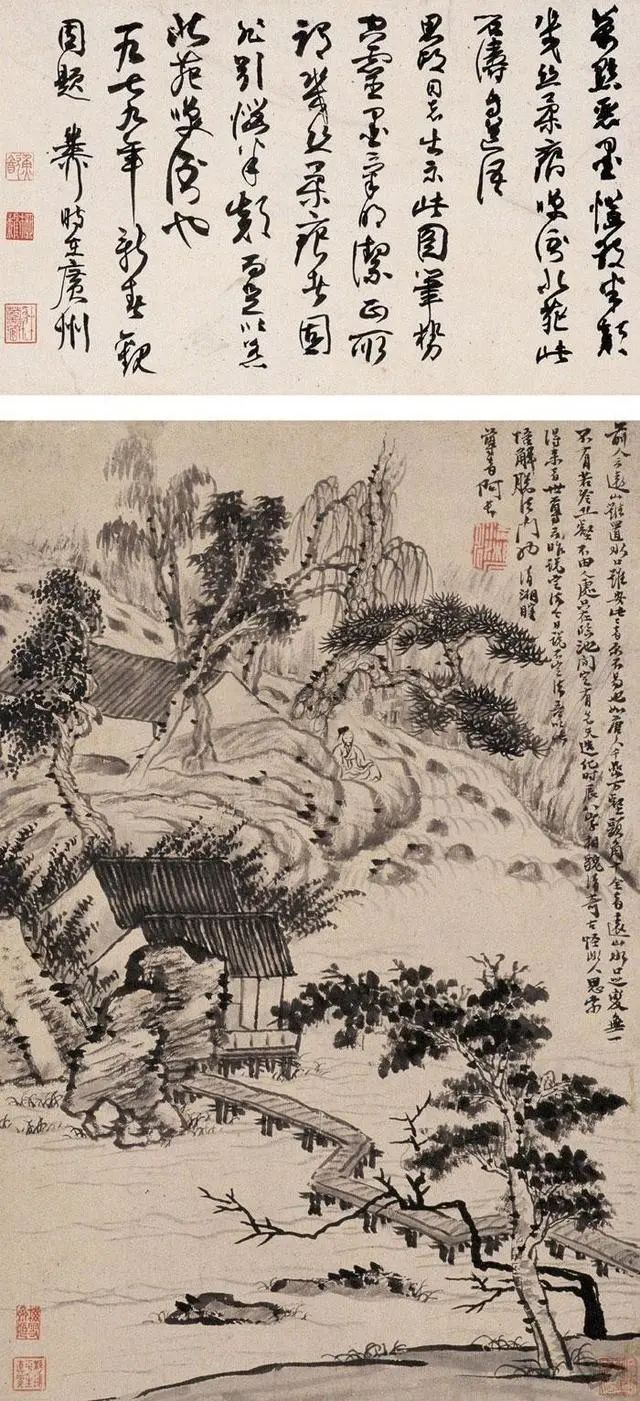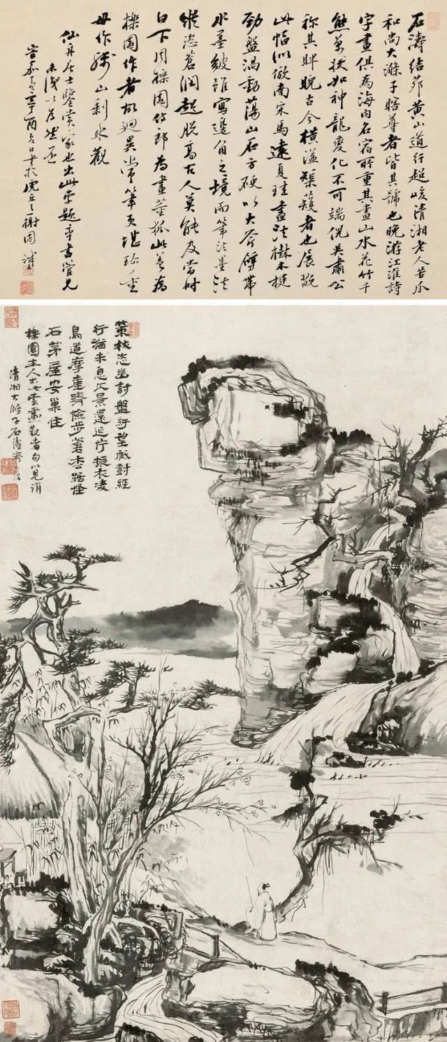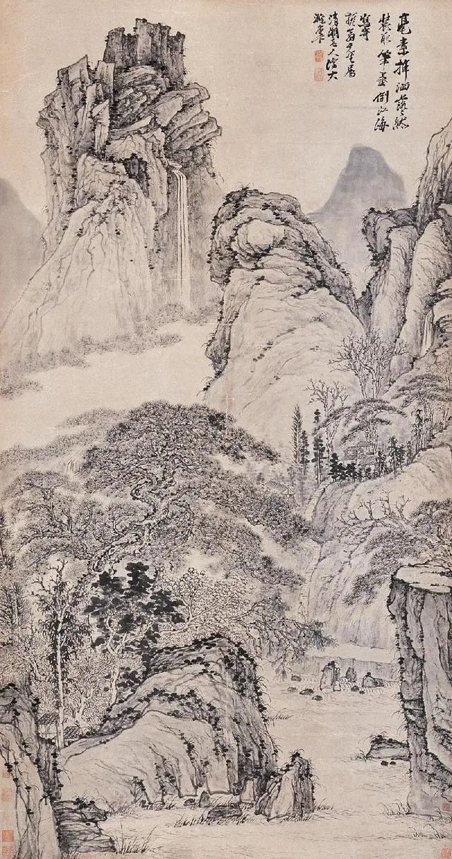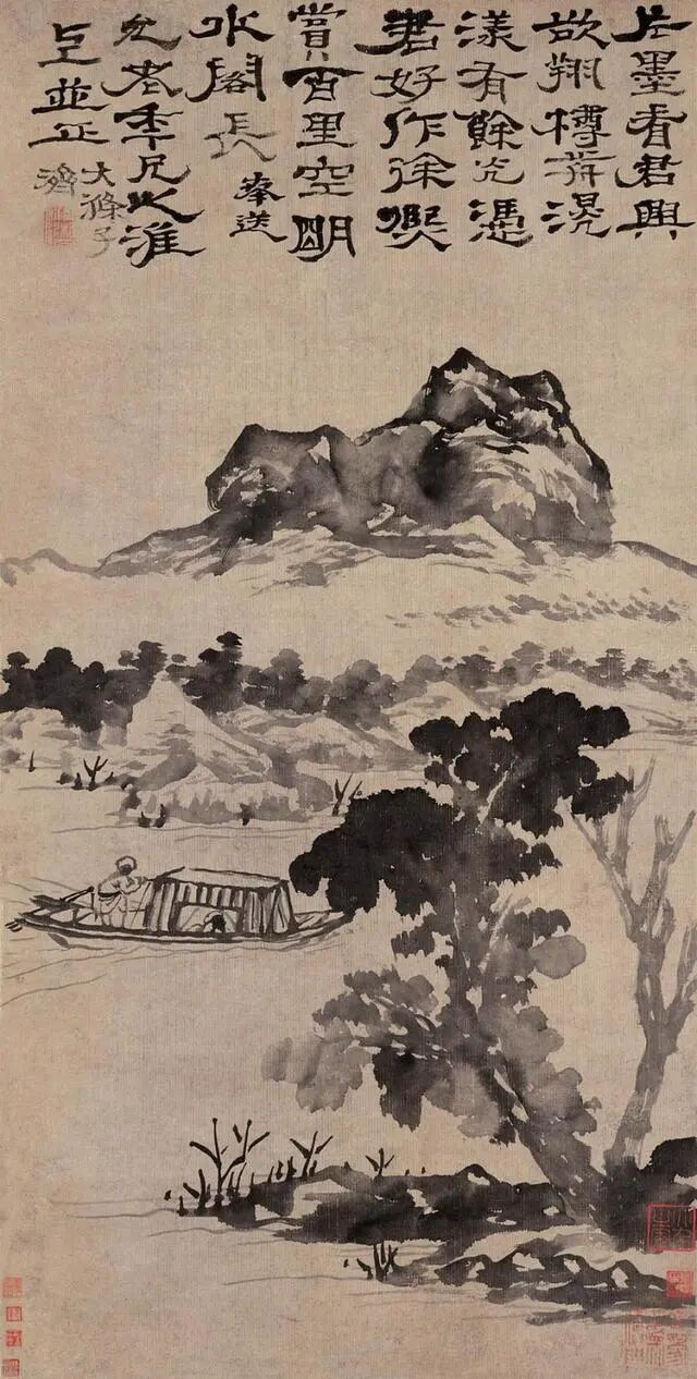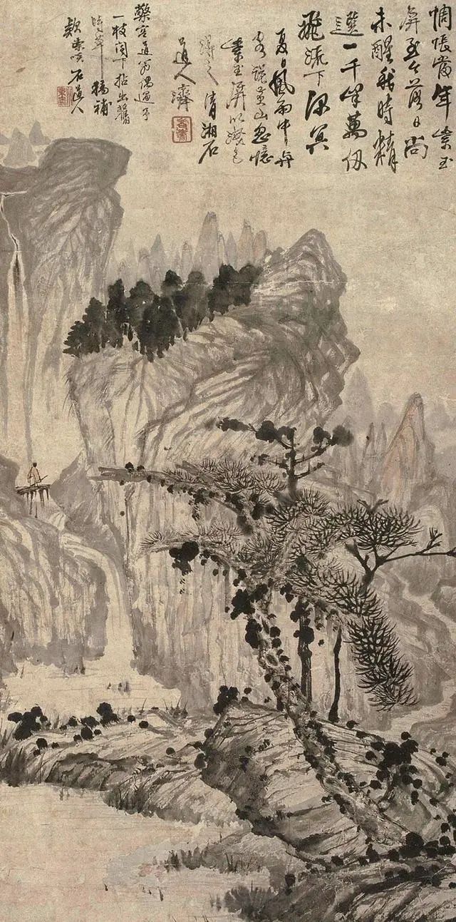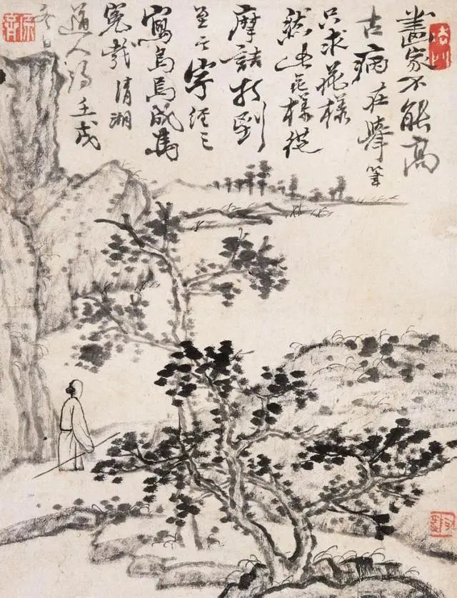 石涛的山水,看着“不正经”,却藏着大智慧——他画的是心里的山水,不是眼里的山水。山歪水乱,恰恰是他对世界的独特理解:自然哪有那么多规矩?想怎么长就怎么长,想怎么流就怎么流!这画,看得人直想拍大腿:这老头儿,太会“玩”了!